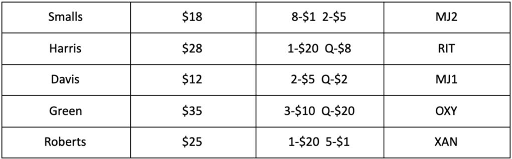 Apart from the few loose bills that fell out on the path, most of the money was organized in stacks of rubber-banded bills, each totaling $200. Some stacks were all $20s, others a mix of $1s, $5s and $10s. In all, there were 80 stacks of cash. A gallon sized Ziploc full of quarters accounted for the heft of the bag and the bruise forming on Dante’s shoulder.