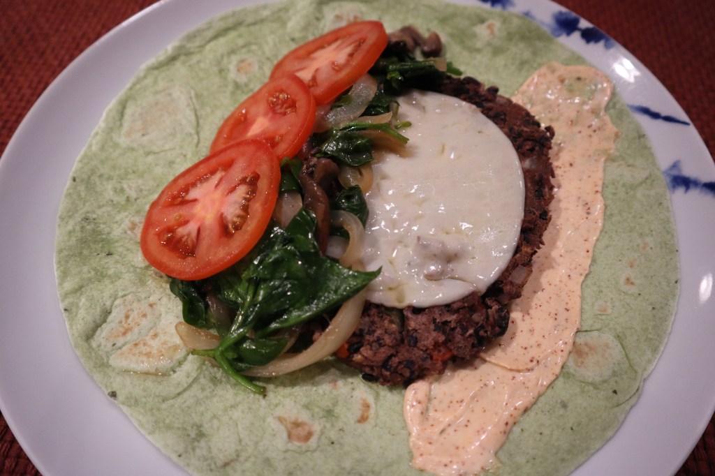 I ate my black bean patty on a spinach tortilla with sautéed mushrooms, onions, spinach and fresh sliced tomato. Without the familiar cushion of ketchup to fall back on, I tossed together a chili aioli. (If we want to talk about great PR teams, hats off to mayonnaise for classing itself up as aioli.)